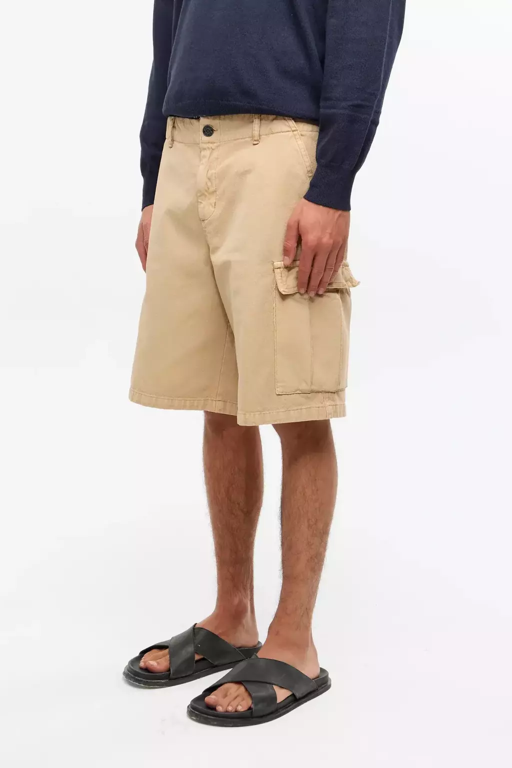 Bermuda de canvas rígido teñido. Cintura continua con presillas, botón jeanero a la vista y cierre. Bolsillos diagonales en delantero y bolsillos ojales con tapa en espalda. Bolsillos cargo con tapa en laterales de la pierna.