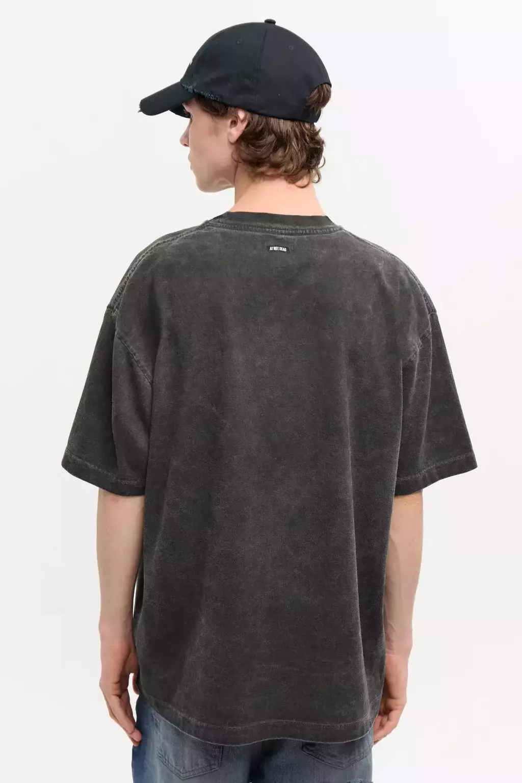 Remera manga corta de cuello redondo y calce oversize en jersey de algodón pesado. Teñido y gastado fade en prenda. Estampa en delantero. Posee grifa de marca en espalda.